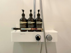 Duschsystemet kan användas med genomströmningsvärmare på 18 kW/h och har ett minimiflöde på 7 liter per minut. Dessutom kan det kompletteras med en valfri EasyReach-hylla för förvaring av duschprodukter.